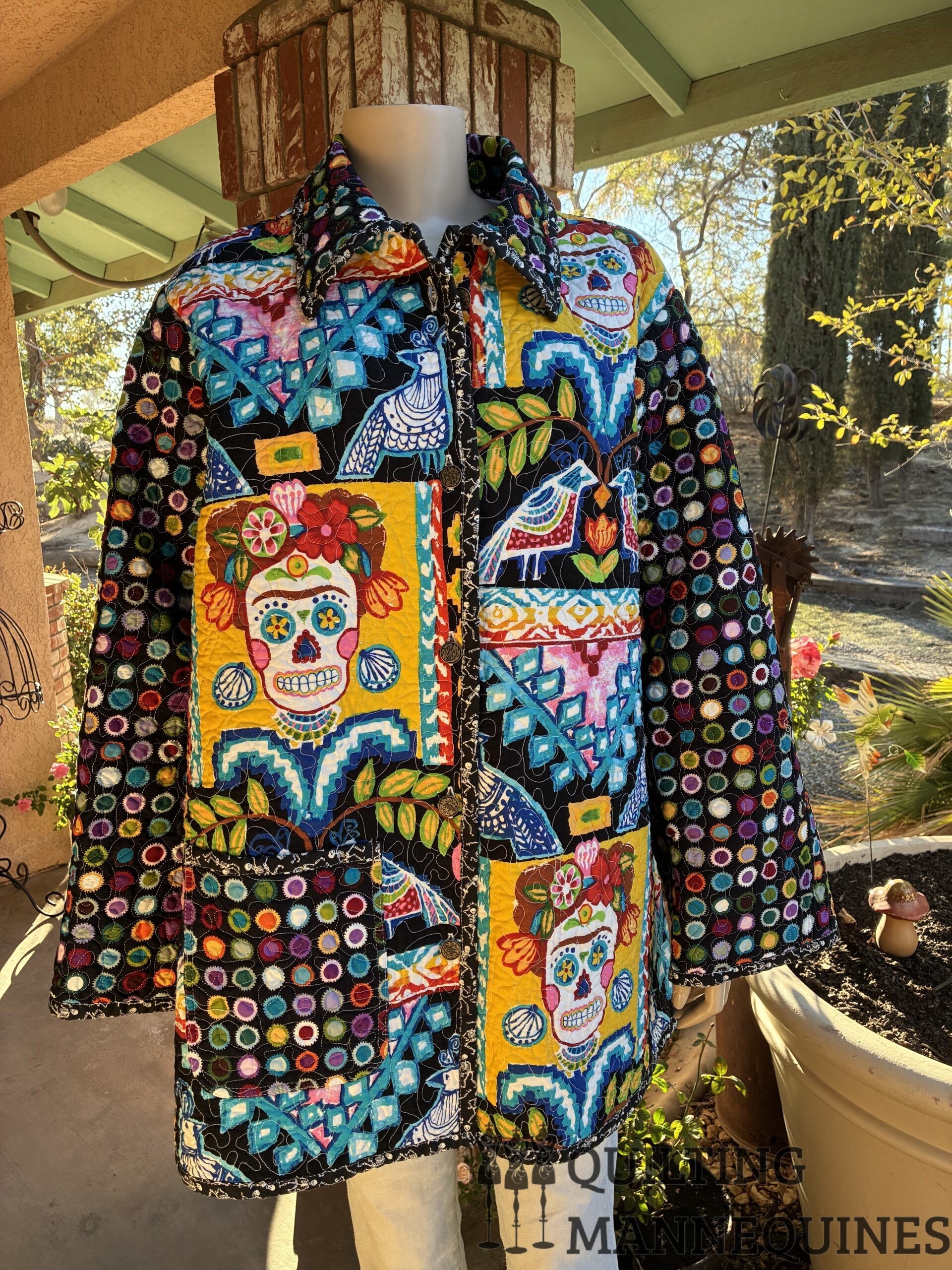 This quilted one of a kind coat was created in our studio with a Frida folkloric wholecloth textile. This coat has one front pocket and one inside secret pocket. It has a closure of five metal vintage buttons.