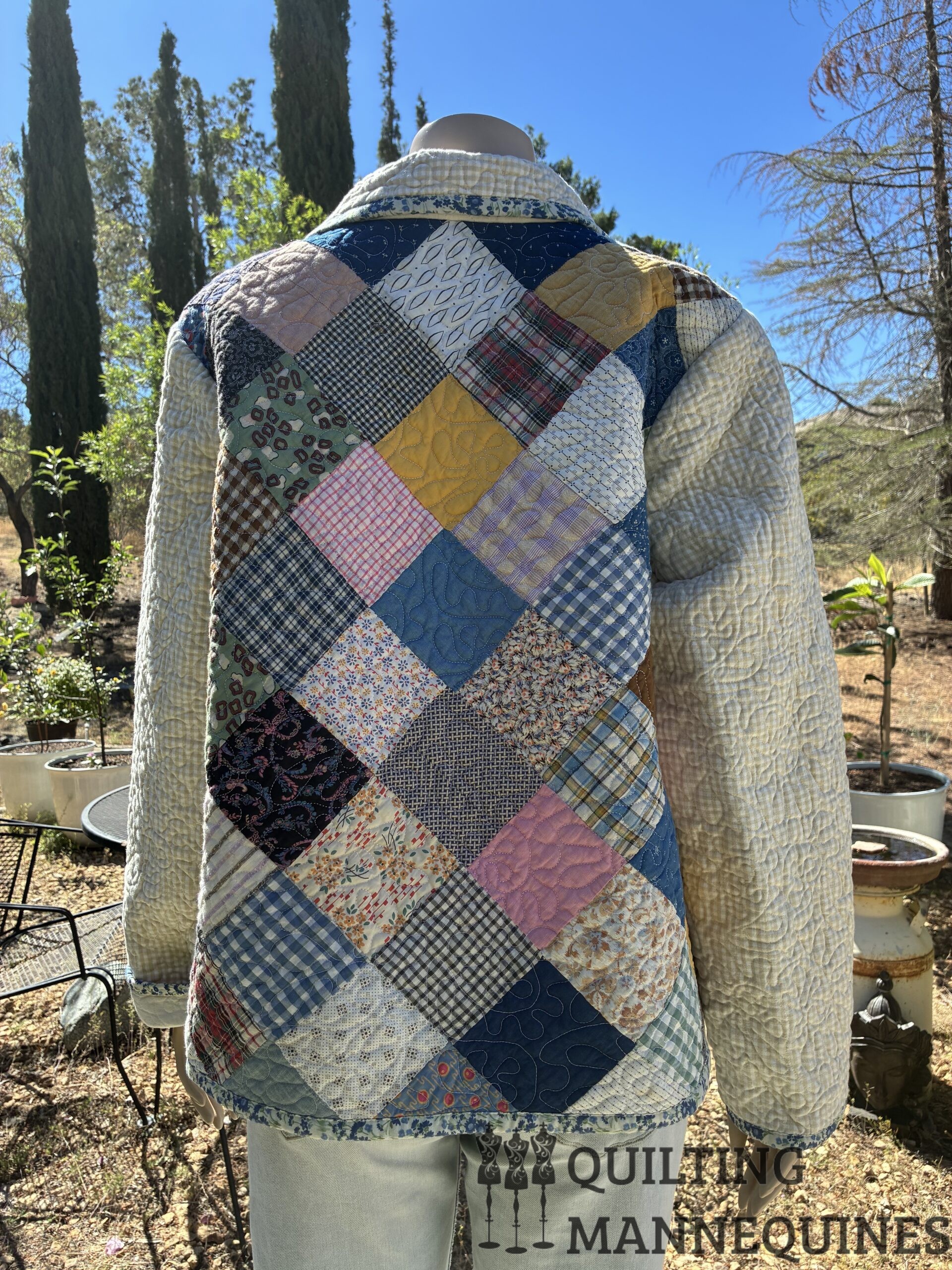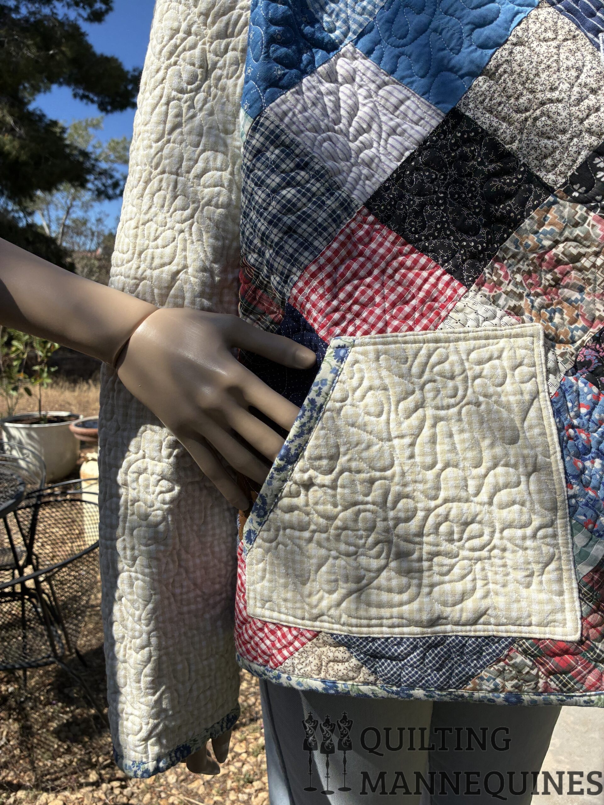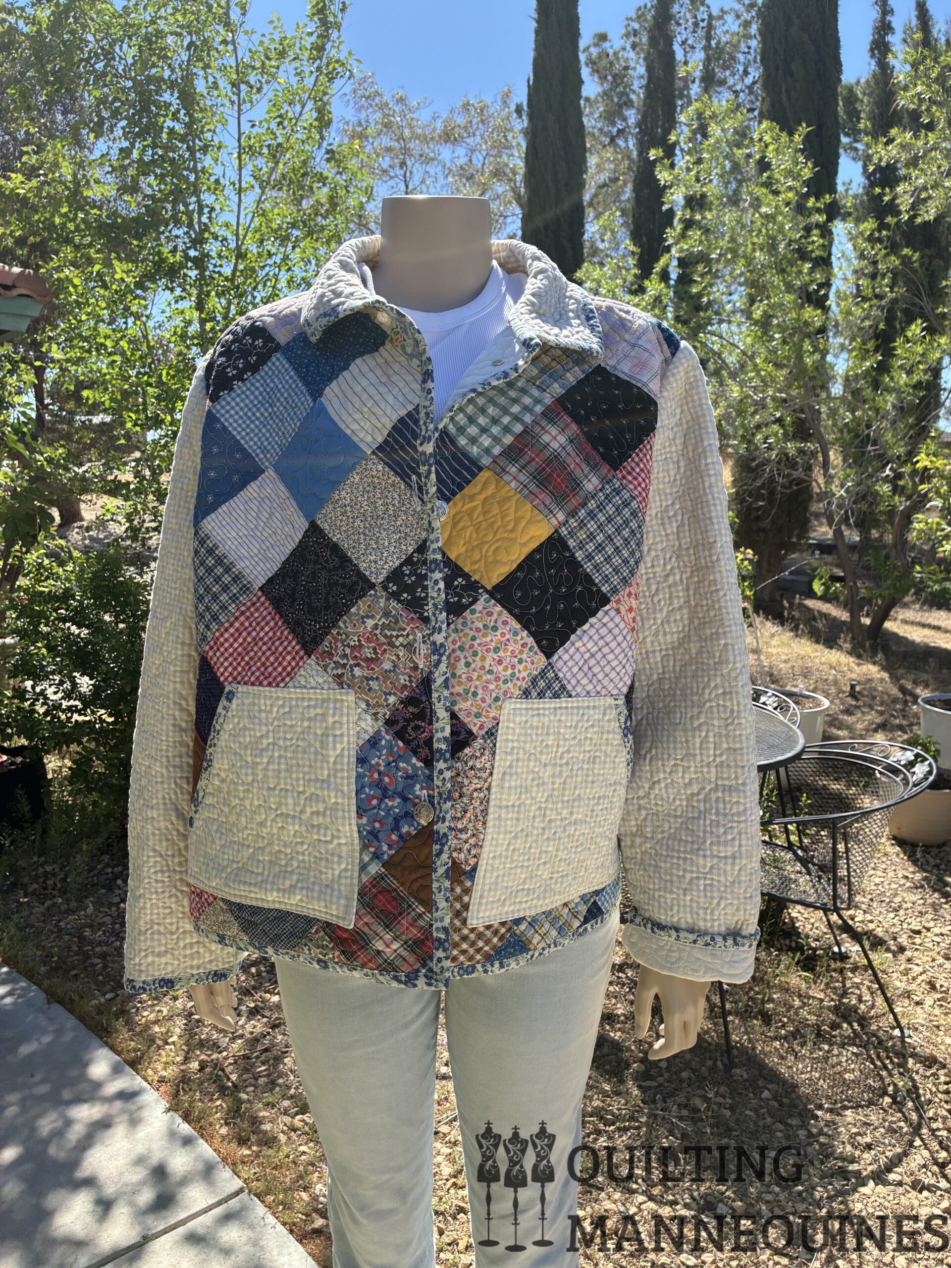 This quilted coat has been created from a beautiful vintage gingham quilt. This coat has two front pockets and has a closure of four metal vintage buttons.