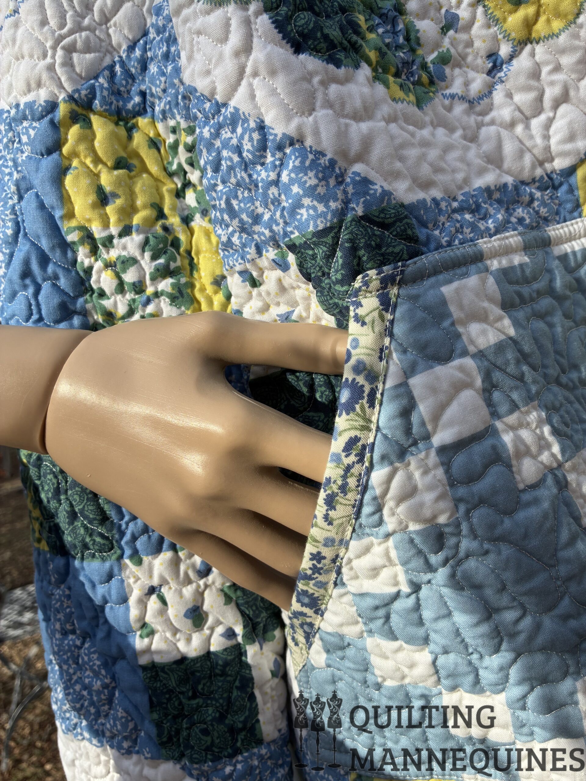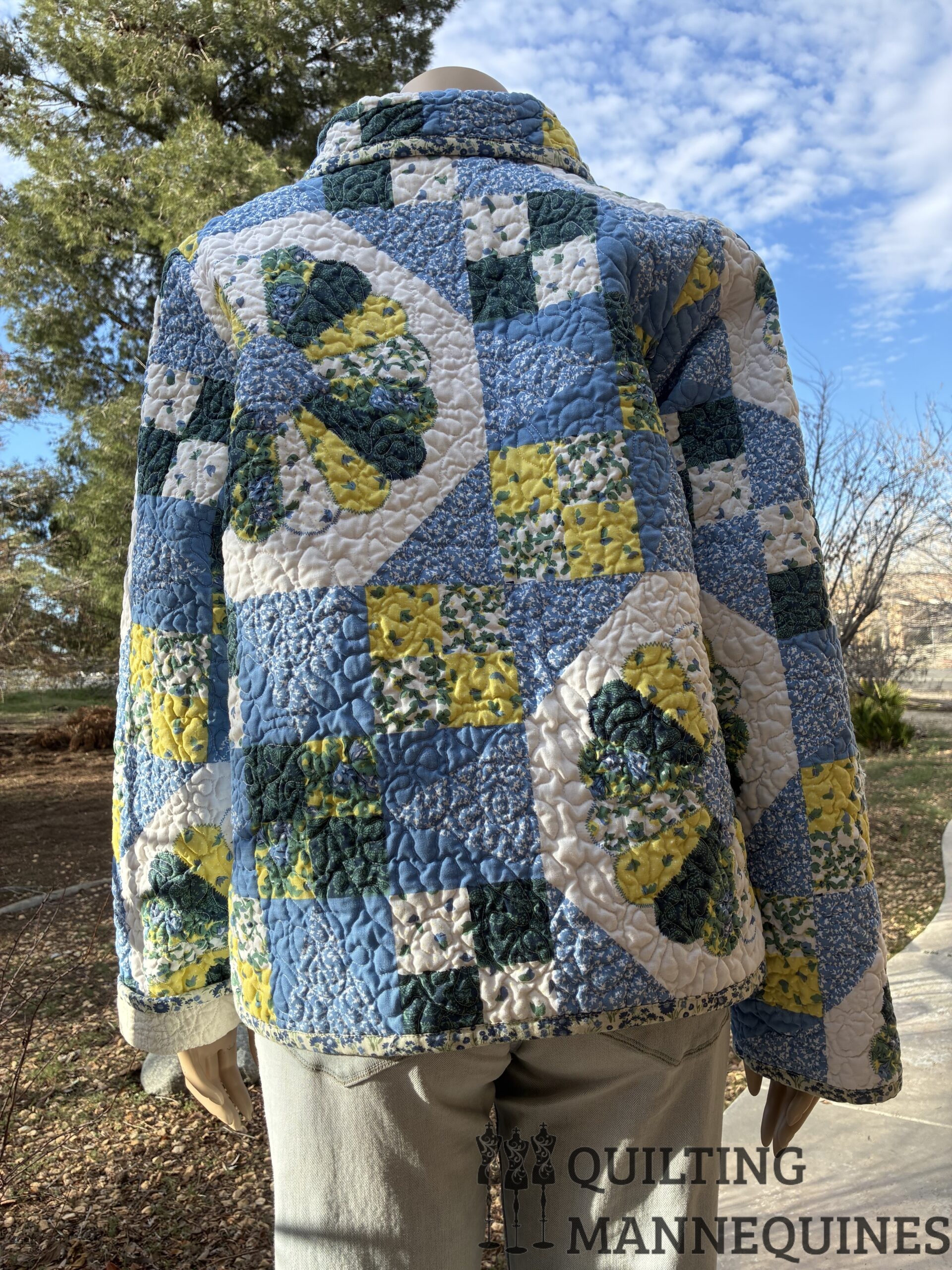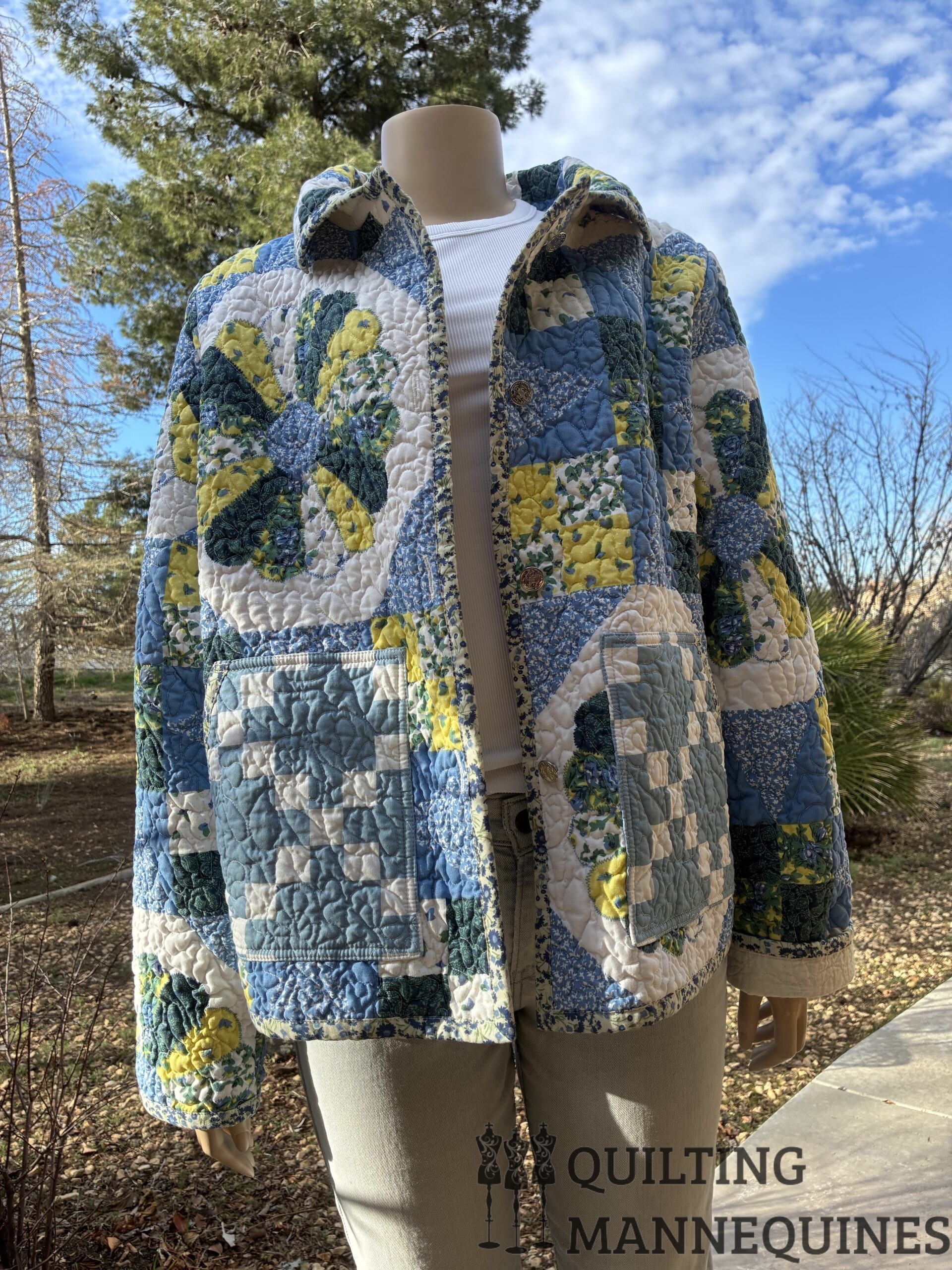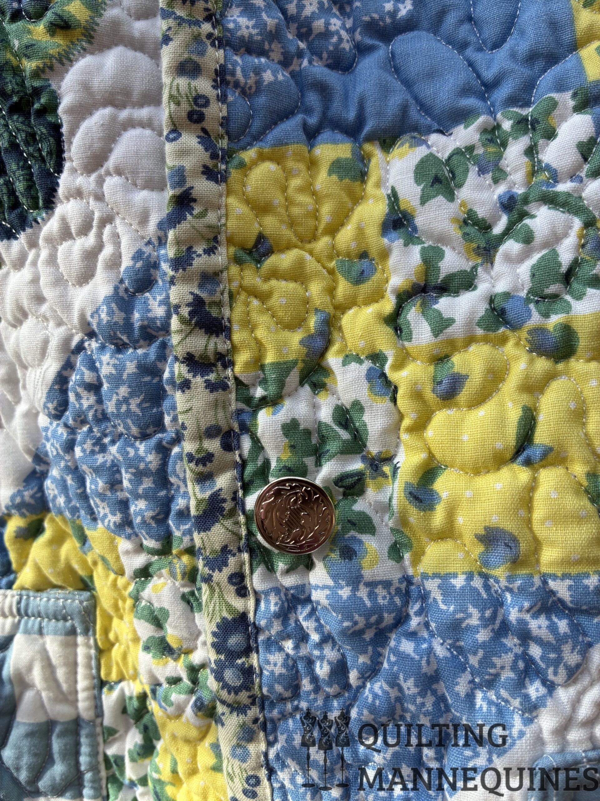 This beautiful quilted coat was created with a wholecloth blue Dresden textile. This chore coat is a button down with four vintage metal buttons and two front pockets.