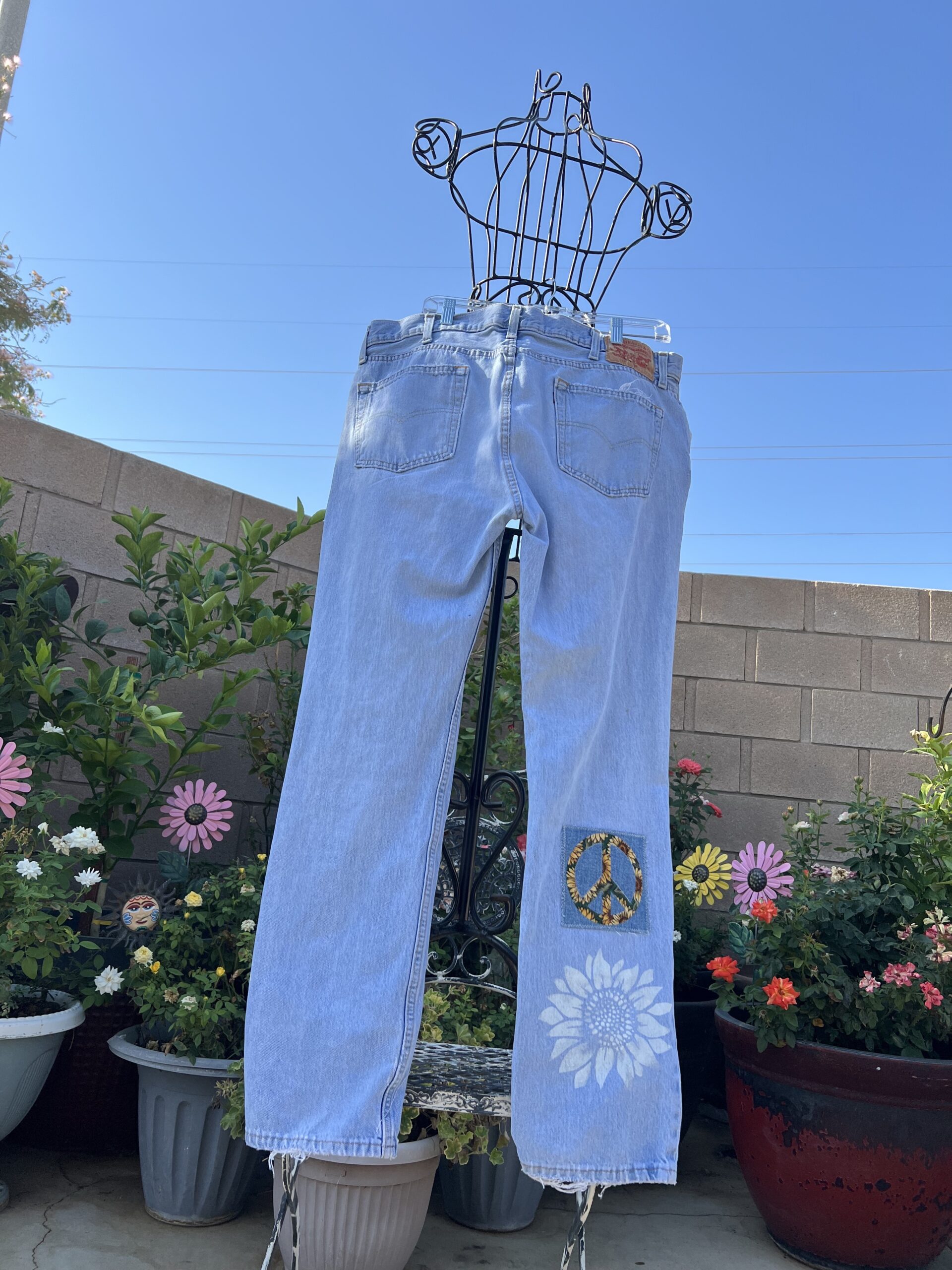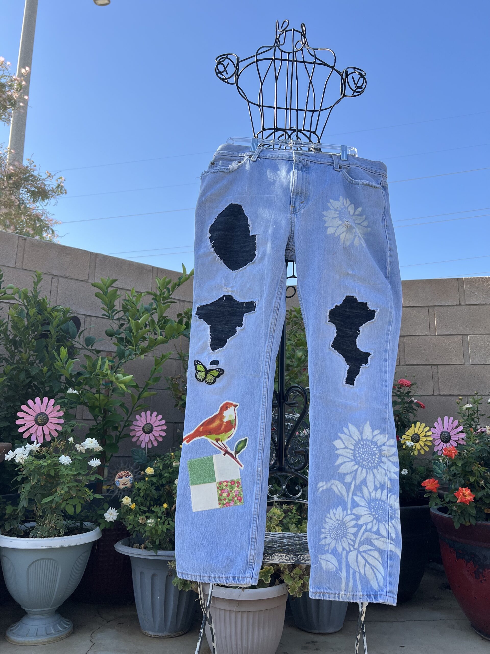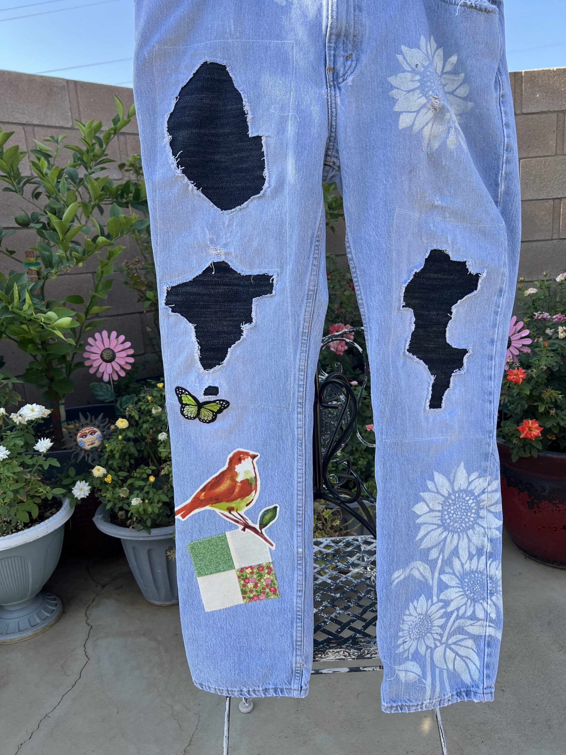Levi 511 vintage ruched (gathered at the back) jeans. These jeans have been embellished with patchwork, stenciling and embroidery.