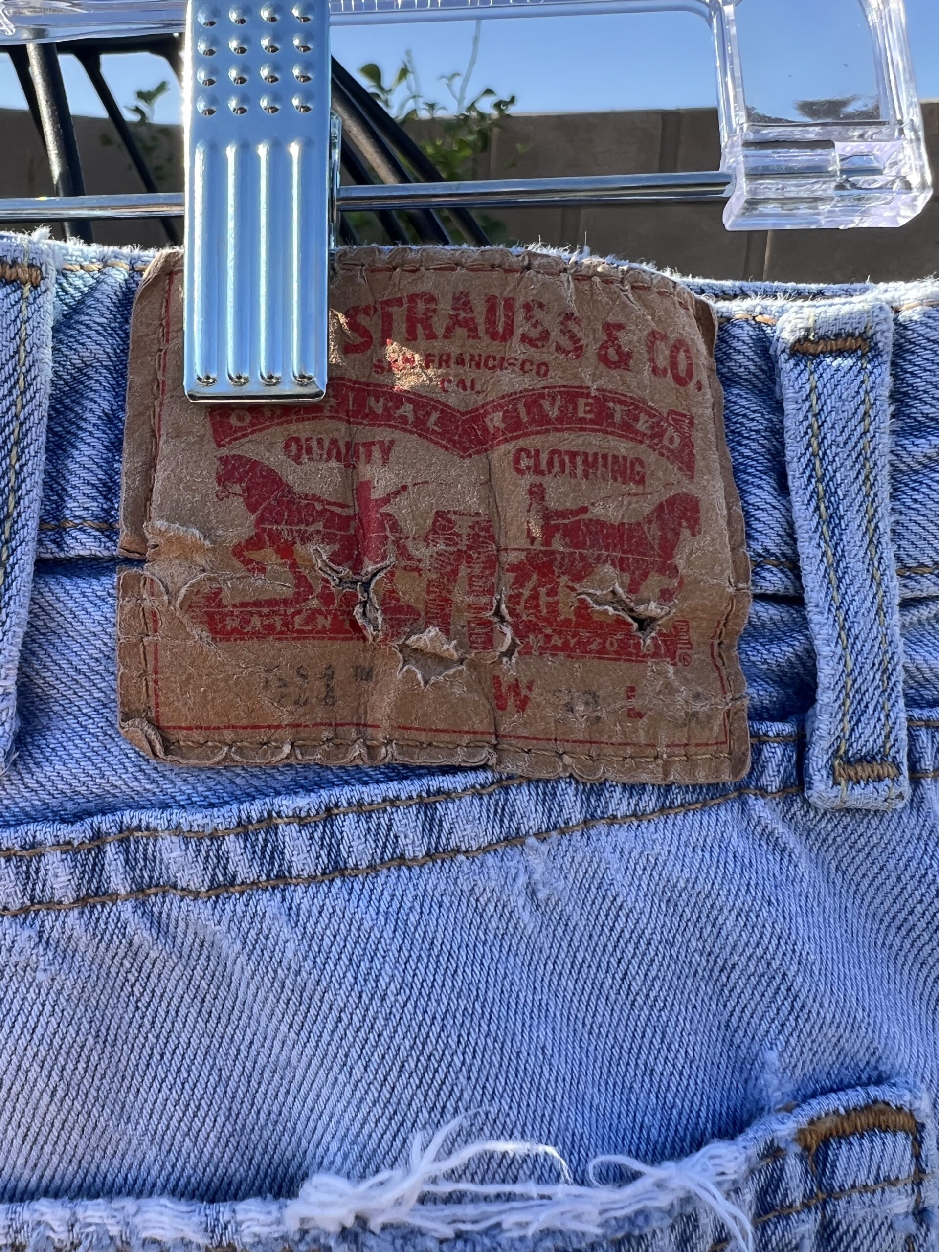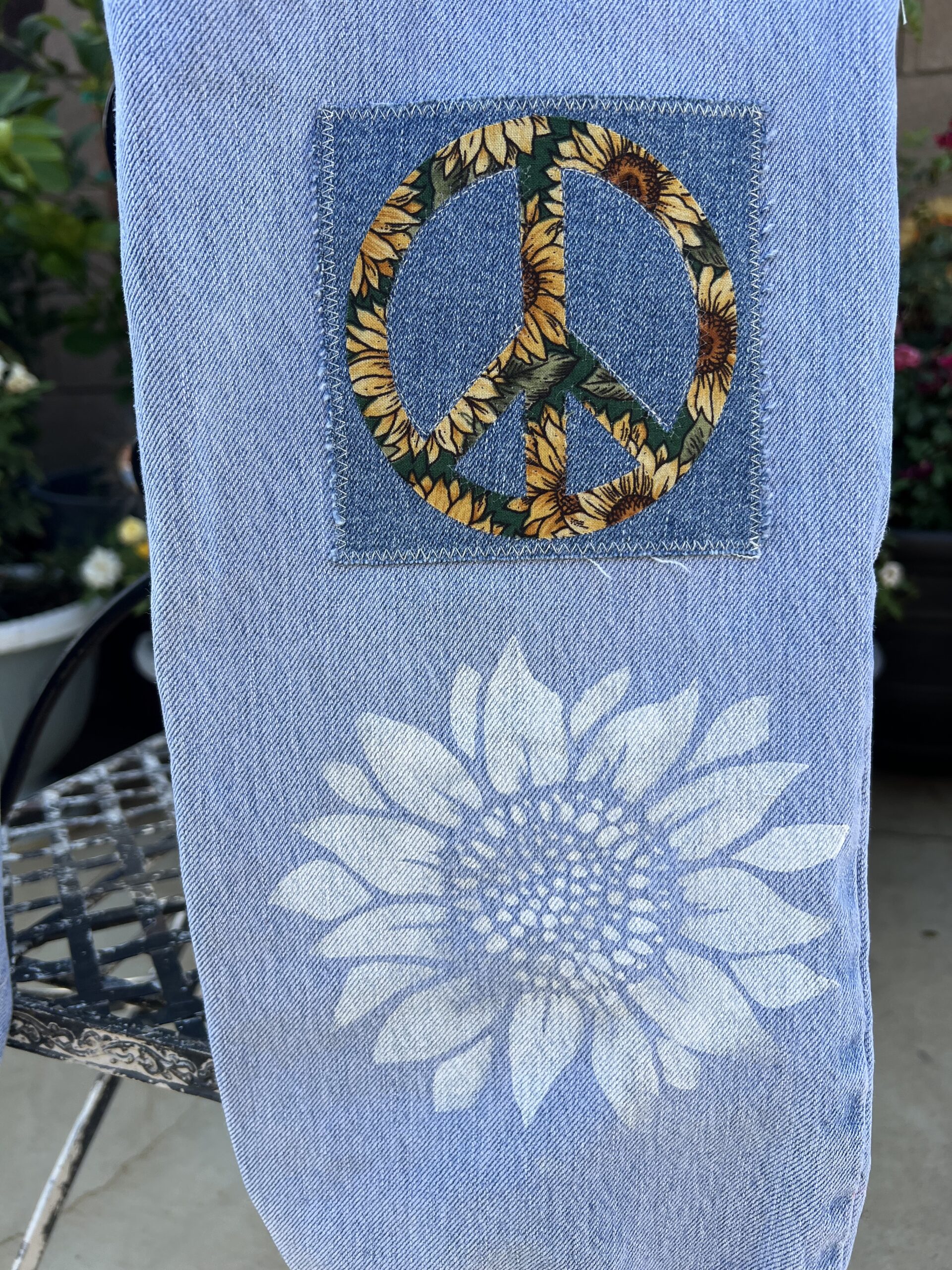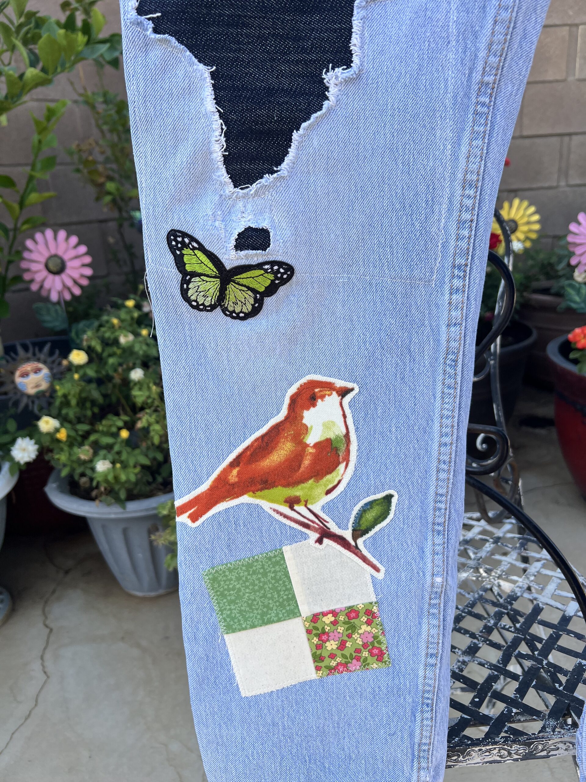 Levi 511 vintage ruched (gathered at the back) jeans. These jeans have been embellished with patchwork, stenciling and embroidery.
