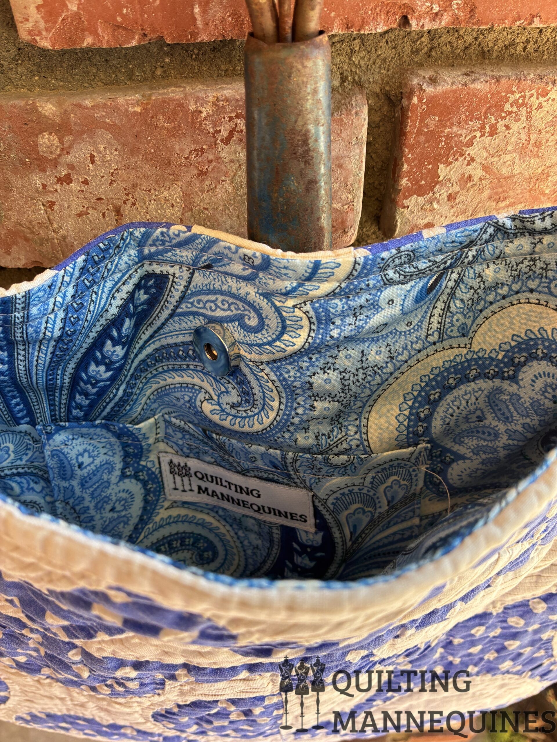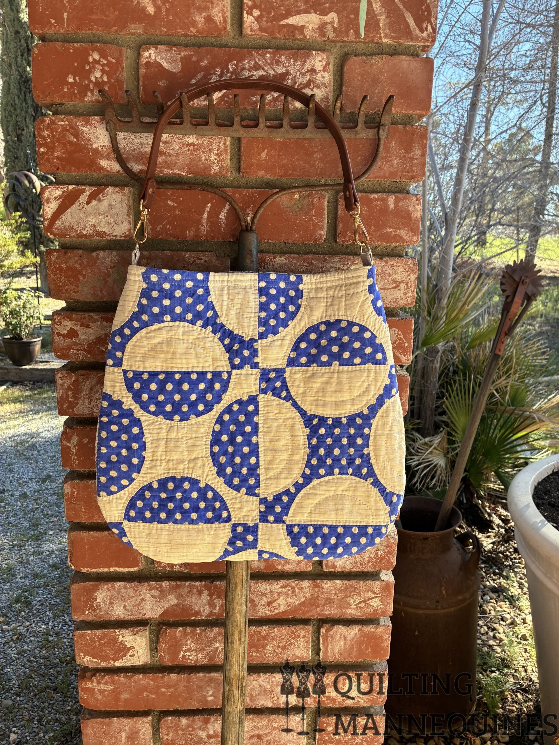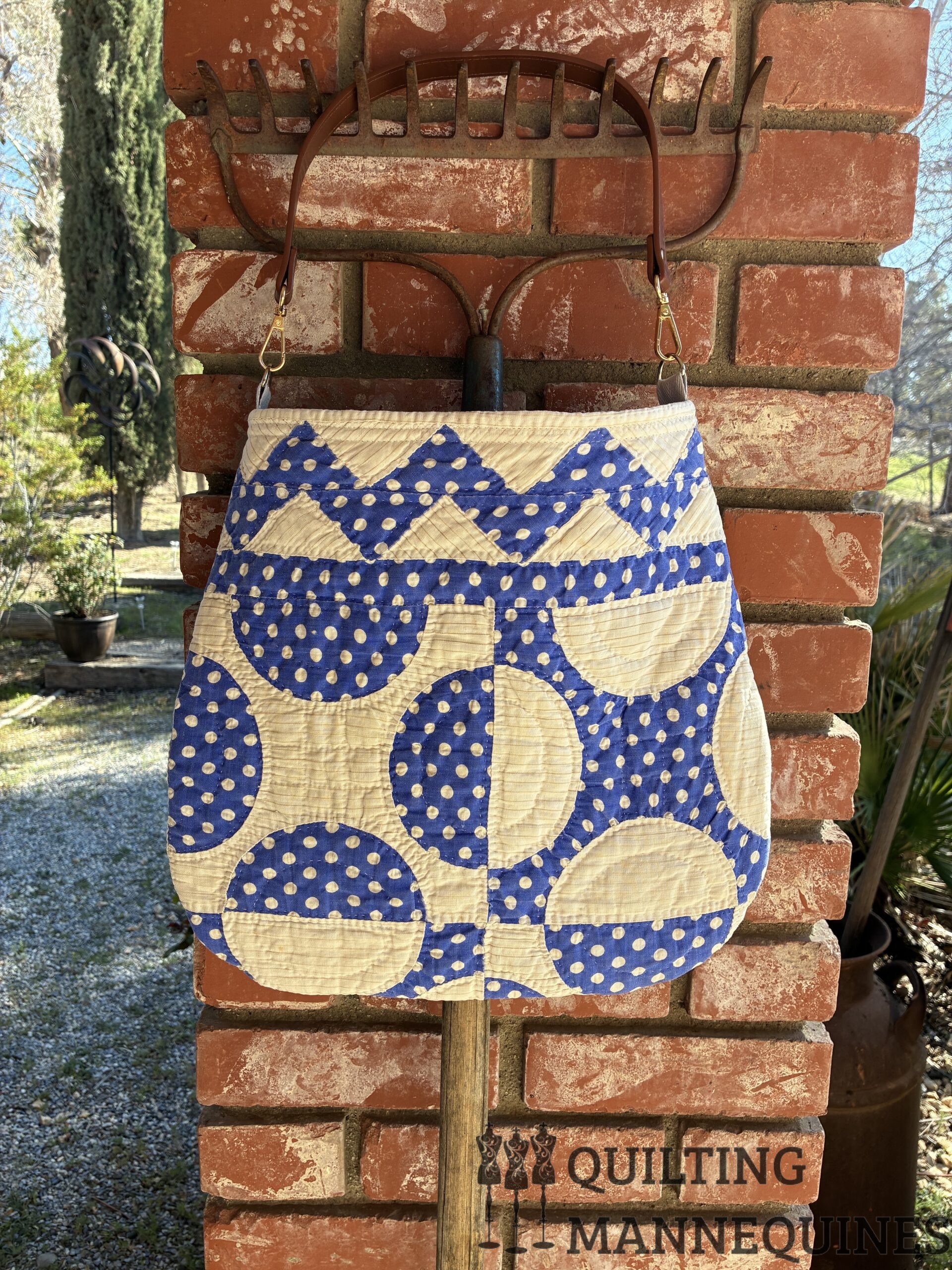 Oval shaped handbag made from a vintage circle dot quilt.  This bag is fully lined with one large pocket and snap closure.