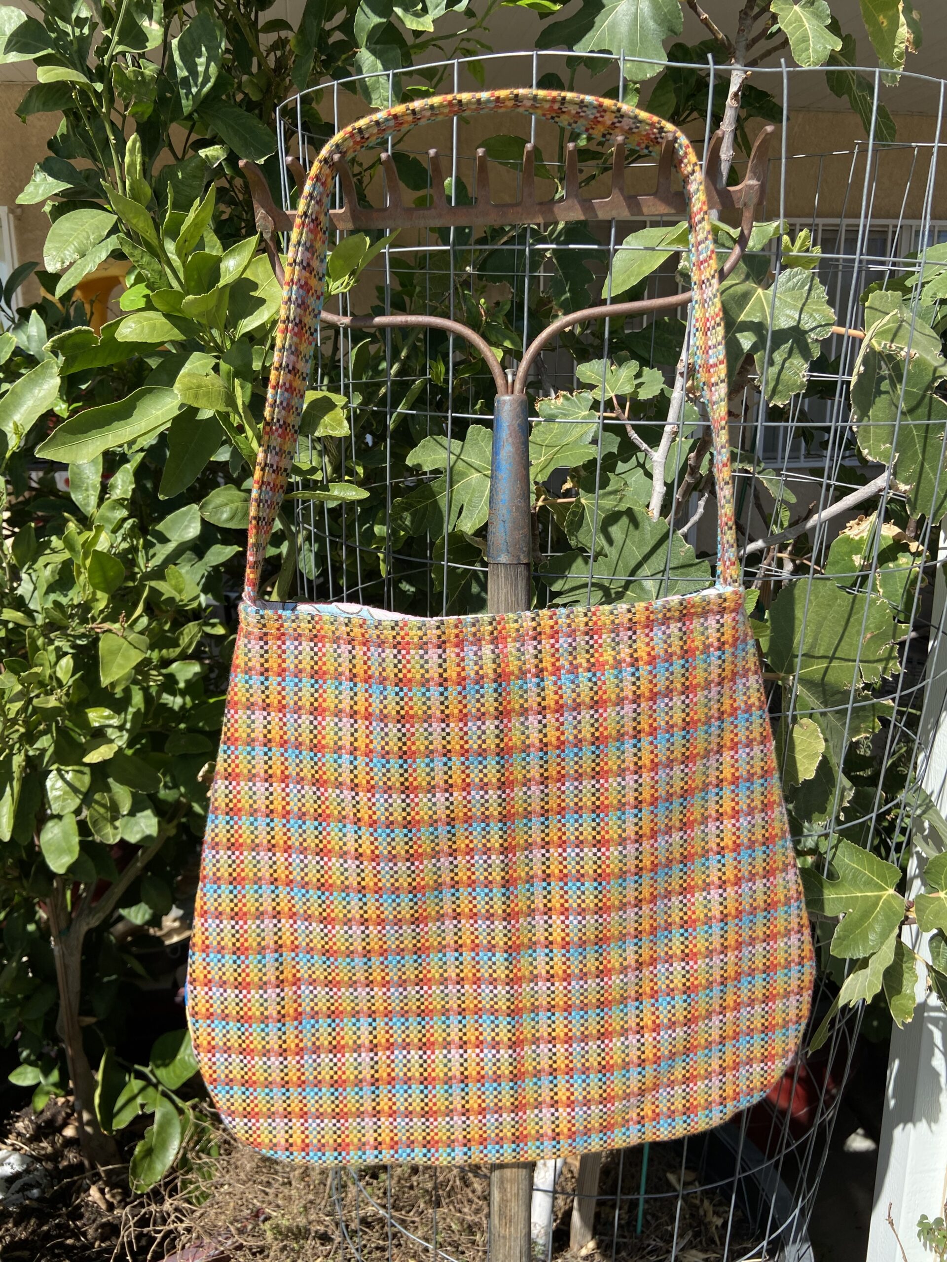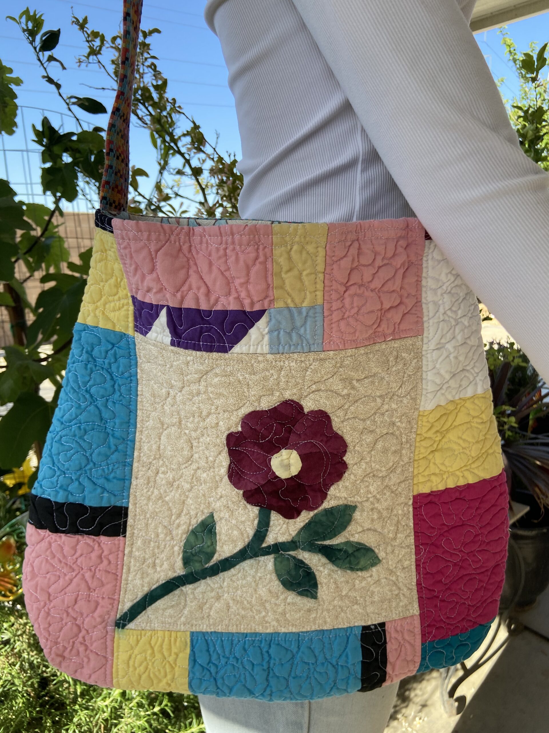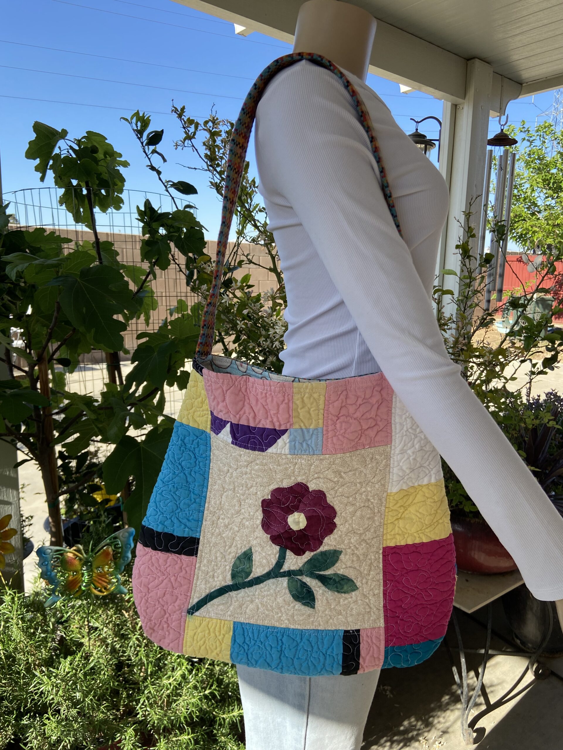 Luna quilted hand bag is made from a beautiful array of bright solid textiles. Backing and strap are made from a bright home dec fabric. Bag is fully lined with one large pocket and a snap closure.