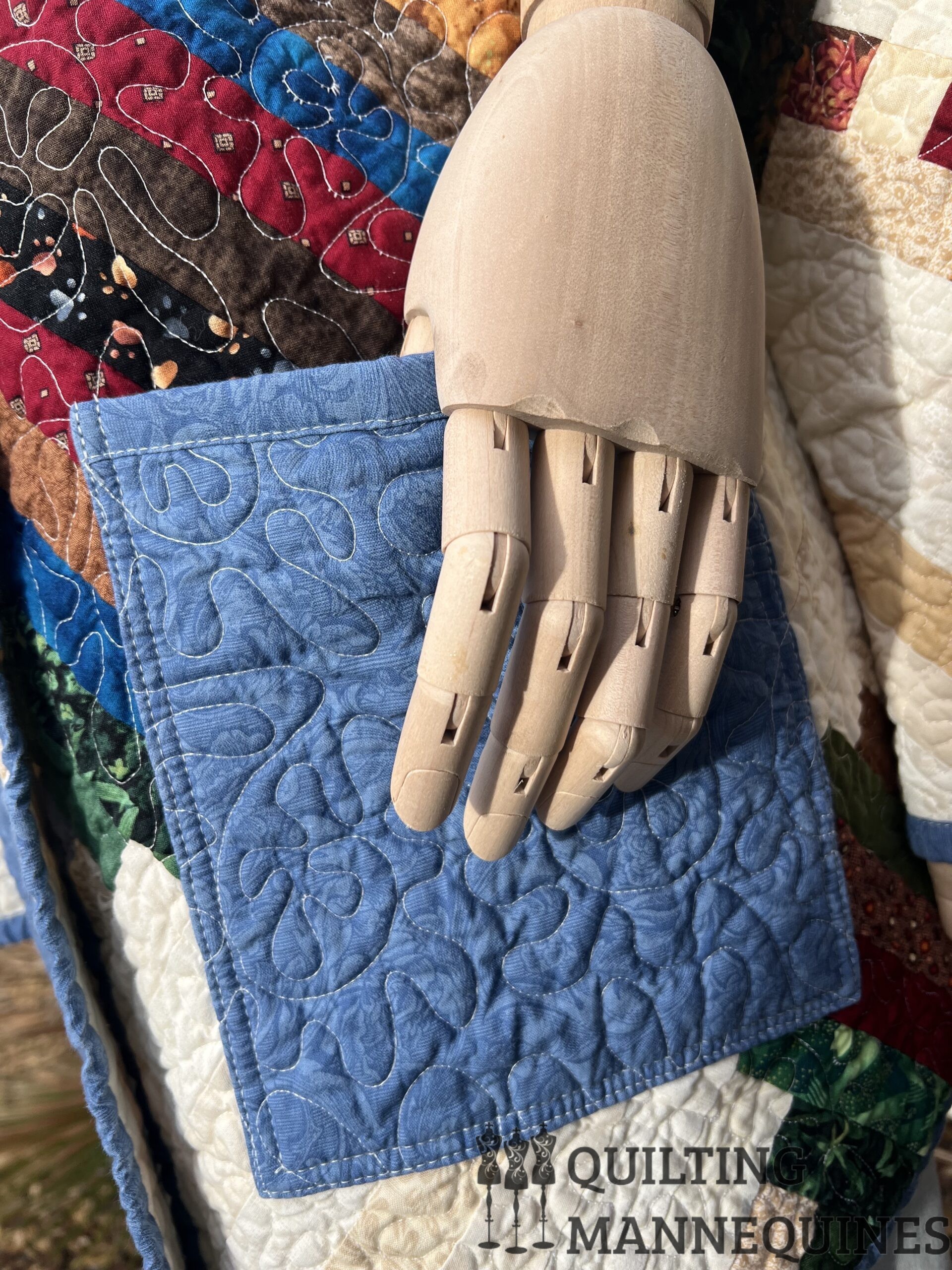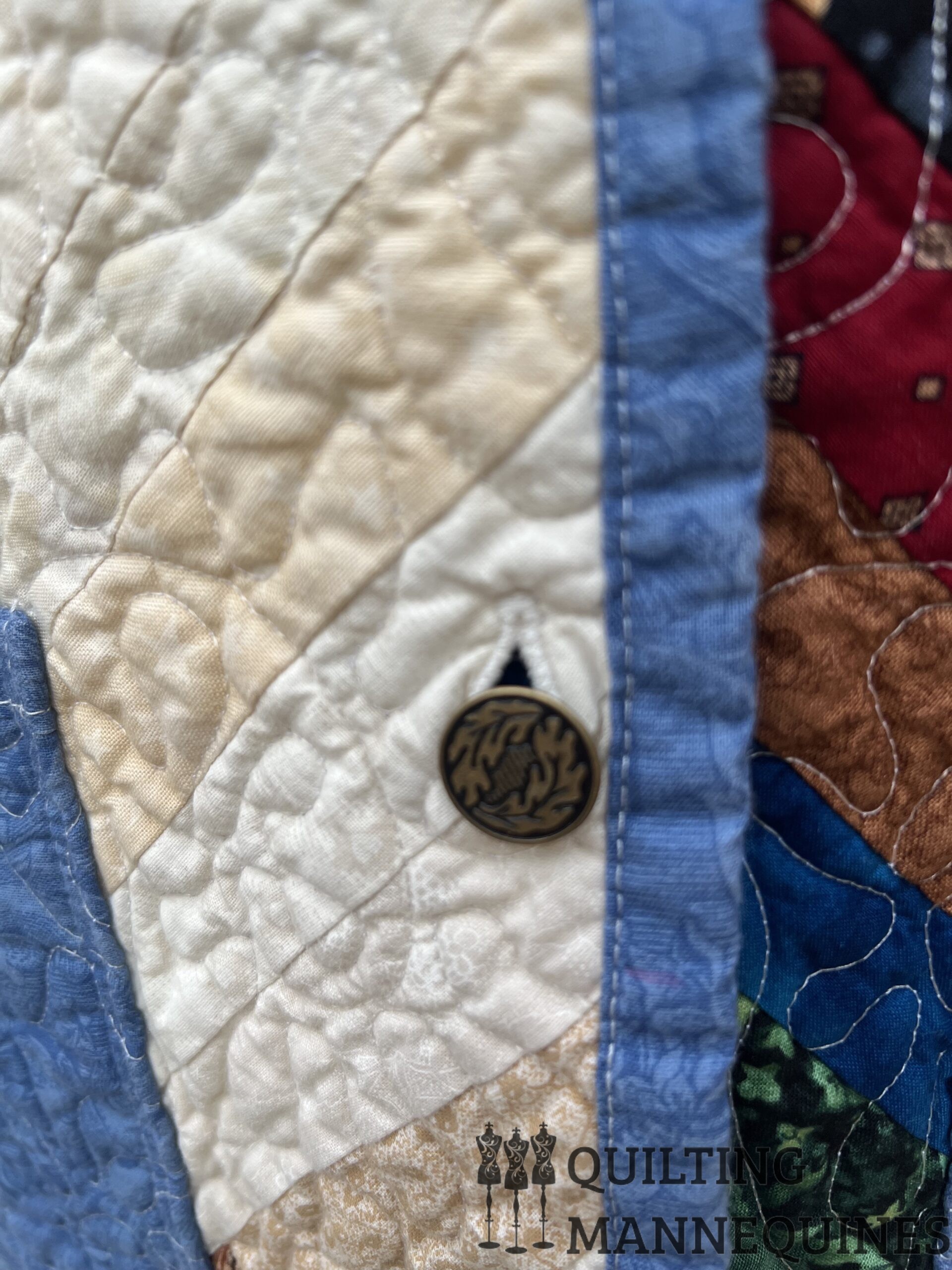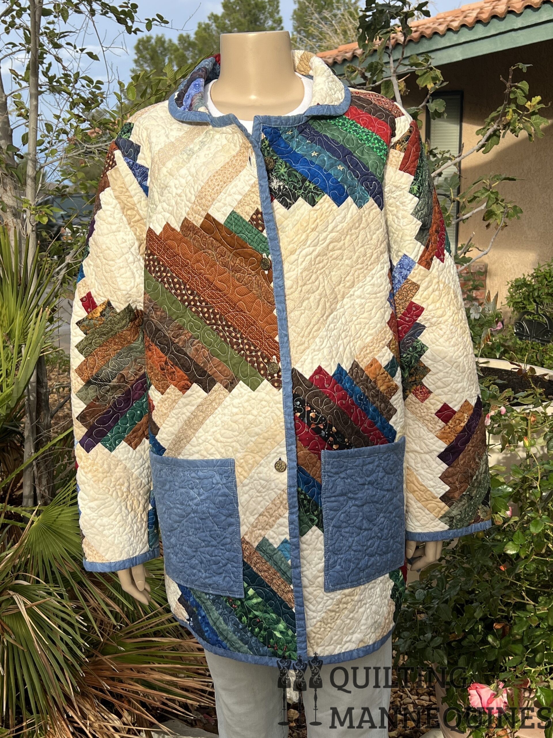 This quilted coat was created with a scrappy Courthouse steps quilt. The pattern was created and quilted in our studio.  This coat has two front pockets and is a button down using four vintage metal buttons.